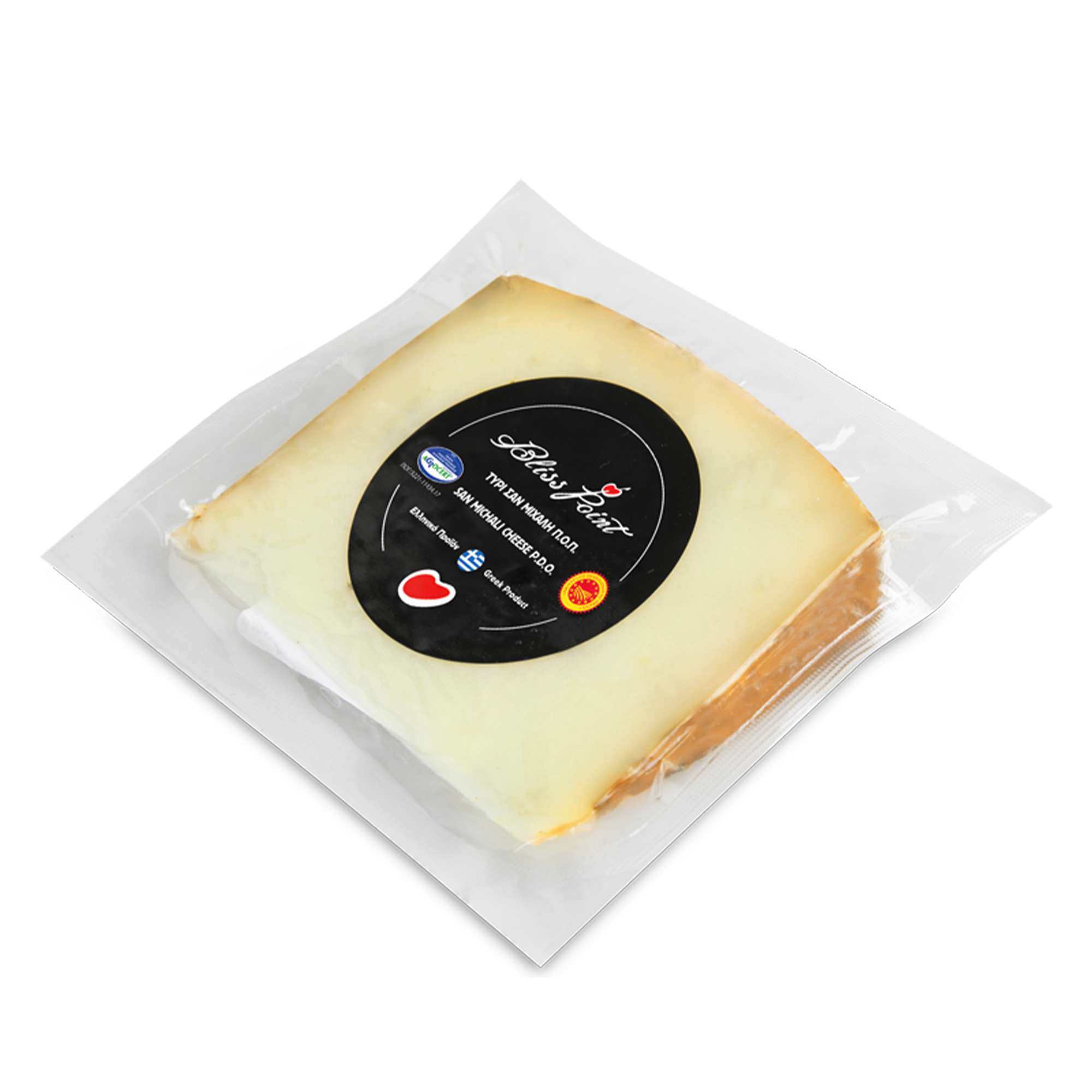 Το Σαν Μιχάλη έχει πικάντικη γεύση, χρυσαφένιο δέρμα και υπάγεται σε ωρίμανση 8 μηνών. Η μάζα του είναι συμπαγής, με ακανόνιστες τρύπες και θρυμματισμό κοπής όπως παρμεζάνα.